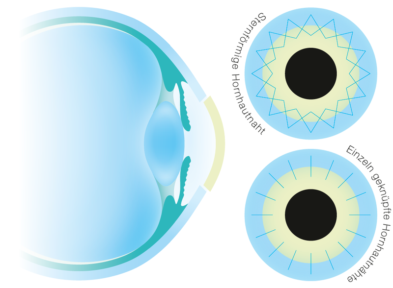 Ob das Transplantat mit zwei sternförmigen fortlaufenden Nähten eingenäht wird oder einzeln geknüpfte Nähte in entsprechender Anzahl bevorzugt werden, entscheidet der Operateur nach den Umständen des Einzelfalles. Die Fäden, die eingenäht werden, bestehen aus Nylon und sind um ein Vielfaches dünner als ein Haar.